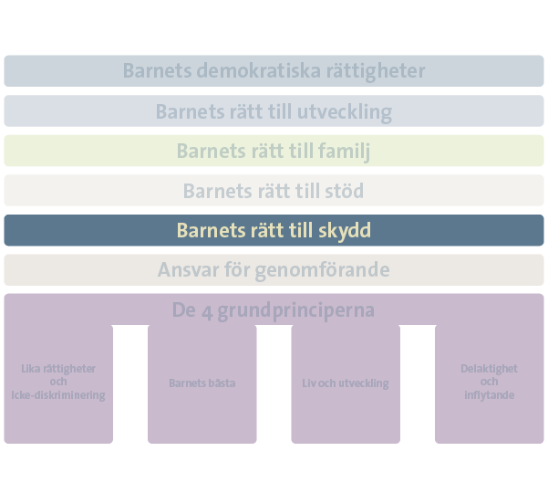 Barnombudsmannen har delat upp rättigheterna i barnkonventionen i sju teman. Ett av dem är barnets rätt till skydd.
