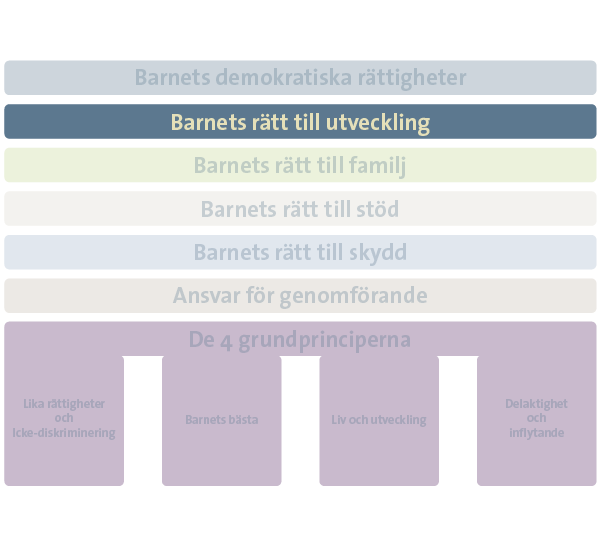 Barnombudsmannen har delat upp rättigheterna i barnkonventionen i sju teman. Ett av dem är barnets rätt till utveckling. Temat innehåller: